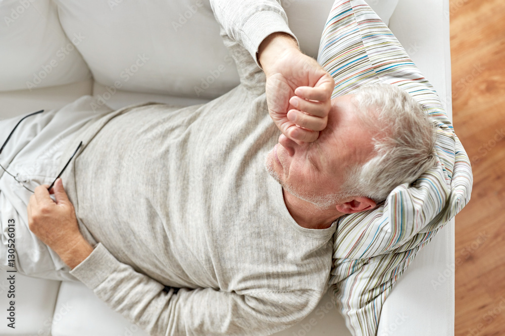 Fototapeta close up of tired senior man lying on sofa at home