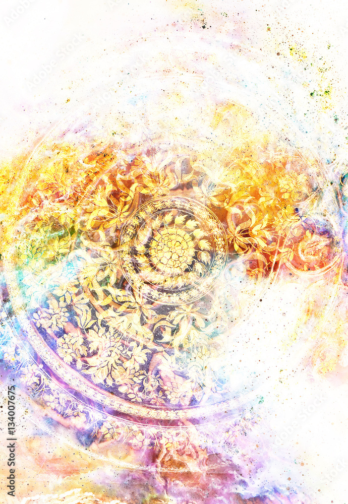 Fototapeta filigrane floral ornament with mandala shape on cosmic backgrond, computer collage