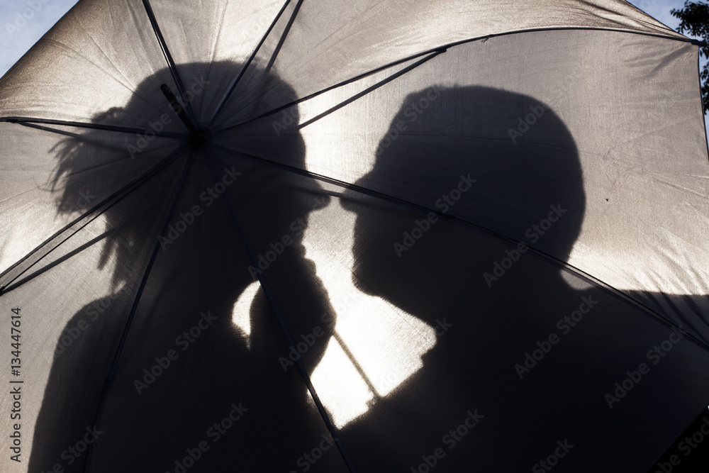 Fototapeta Jeunes mariés derrière une ombrelle à contre jour.