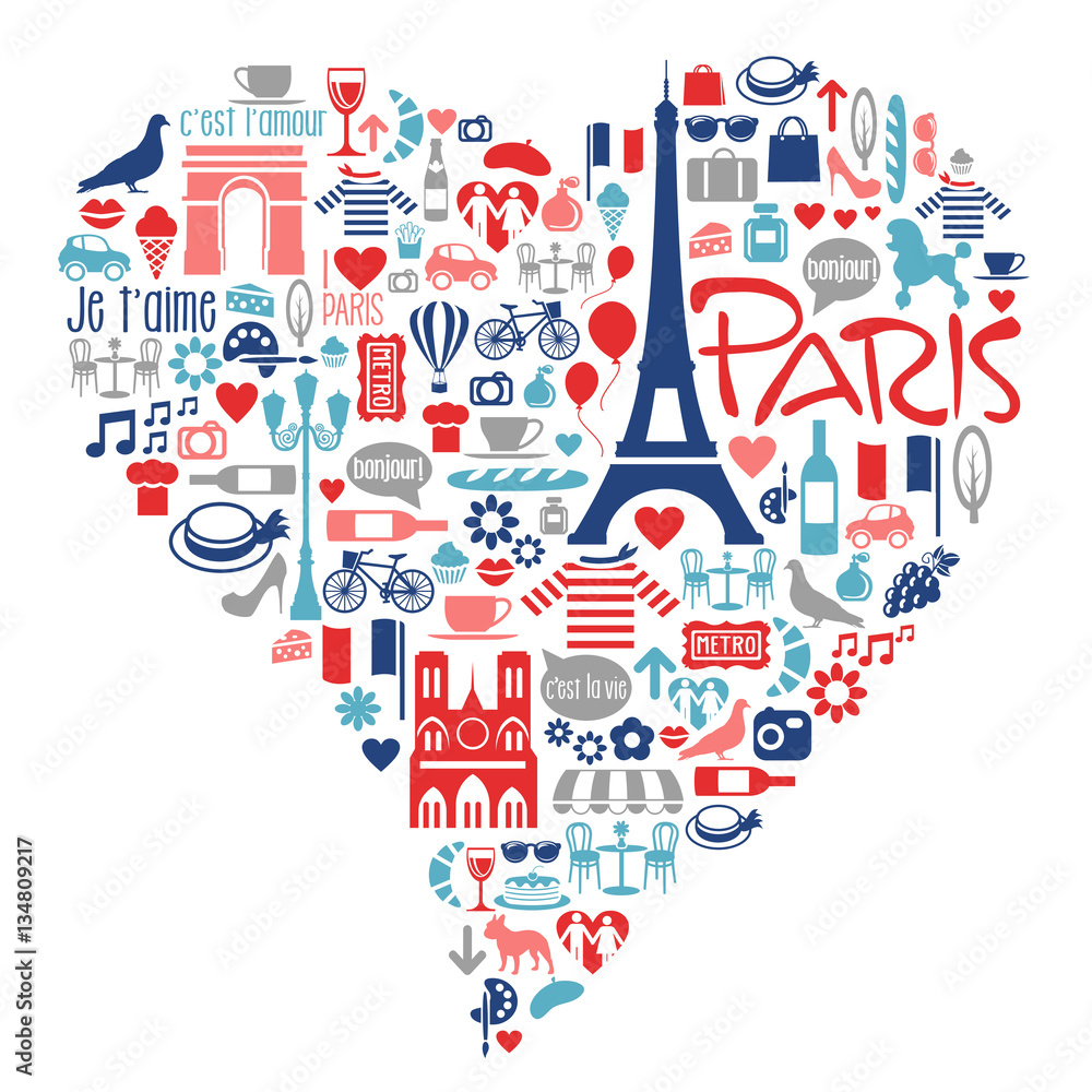 Fototapeta Paris France icons, landmarks, attractions within a heart shape