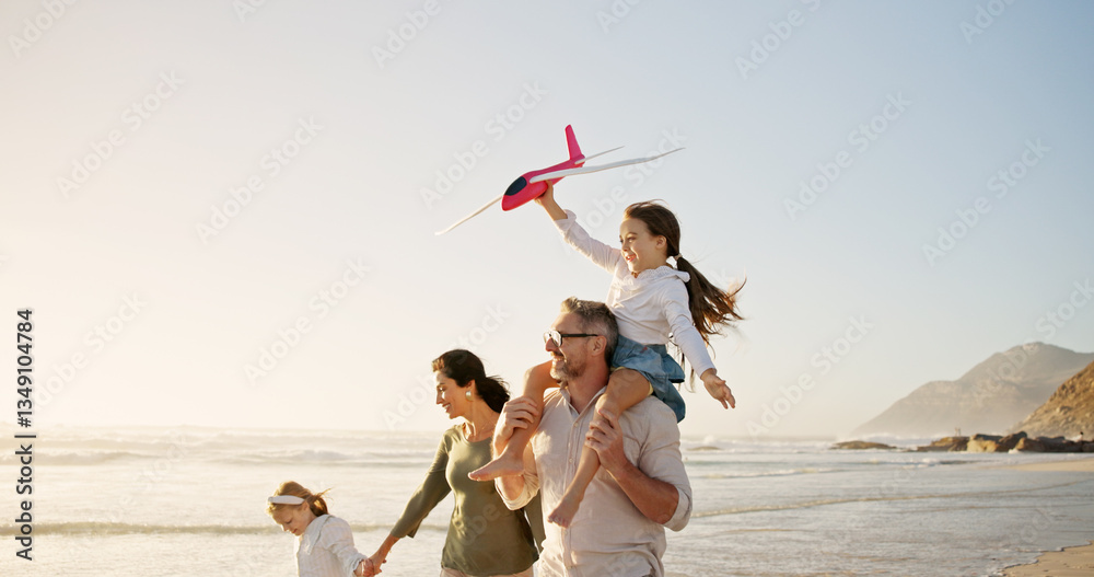 Fototapeta Parents, piggyback or kids at beach for flying, holiday or playing with love, girls or family