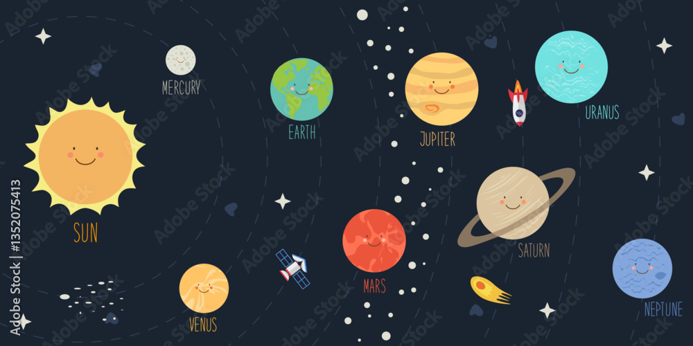 Fototapeta poster cute planets of solar system banner kawaii space kids education astronomy