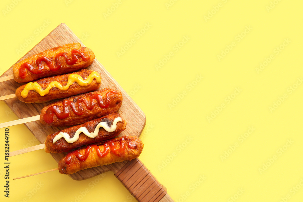 Fototapeta Wooden board of tasty corn dogs with different sauces on yellow background