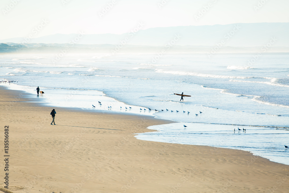 Fototapeta Surfer and visitors walk on the beach at sunrise in Pismo Beach