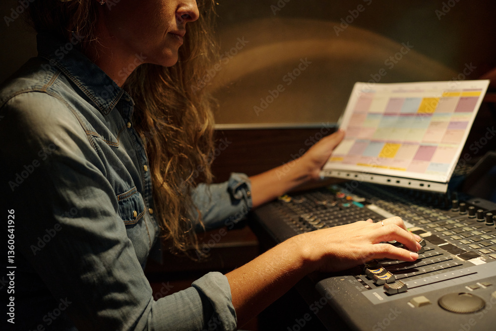Fototapeta Cropped shot of young female journalist with broadcast schedule in hand adjustin