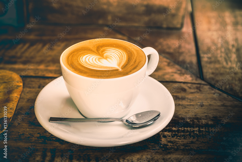 Fototapeta Drak tone filter,Close up white coffee cup with heart shape latt