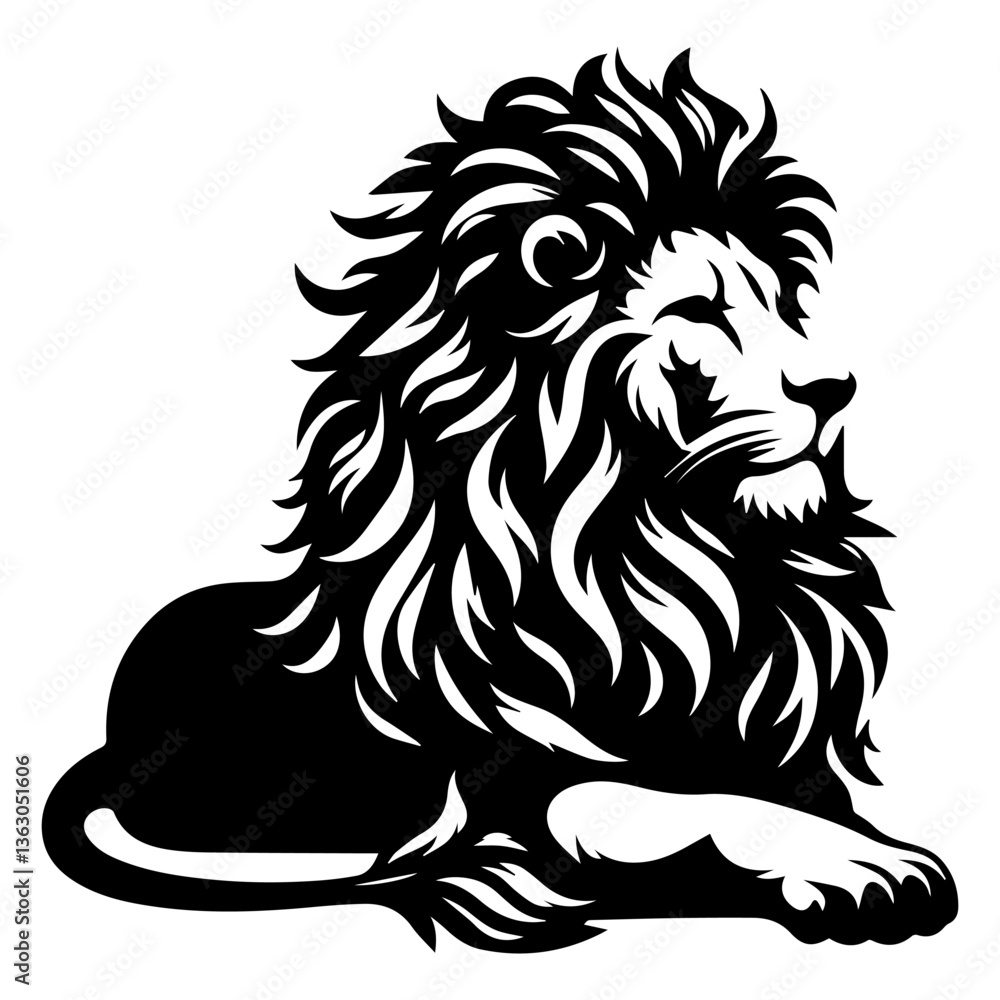 Fototapeta A black and white silhouette of a reclining lion on a white isolated background
