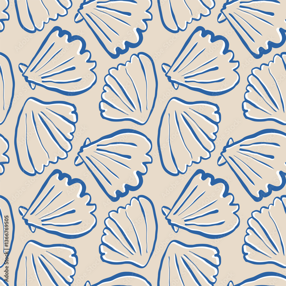 Fototapeta Hand drawn sea shells scallops blue seamless pattern in doodle sketchy style on sandy beige background