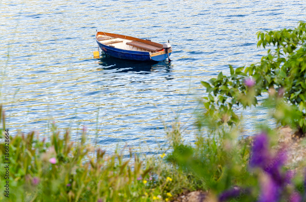 Fototapeta Empty blue boat moored in crisp clear waters of lake or sea