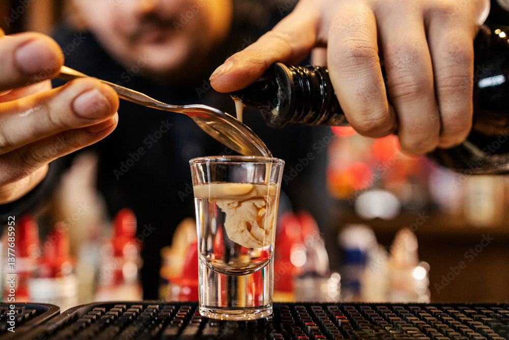 Fototapeta Close up of bartender's hand adding liqueur into a cocktail shot and making monkey brain cocktail