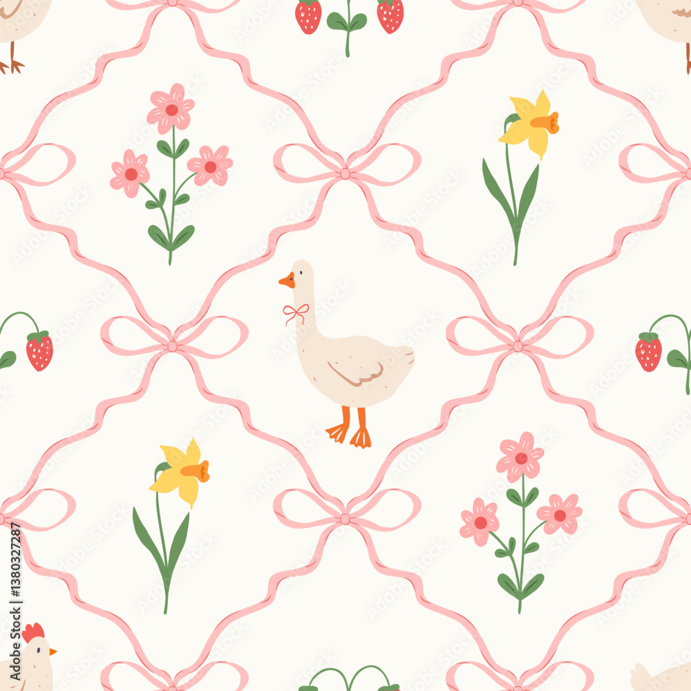 Fototapeta Floral trellis coquette seamless pattern with bows, flowers, goose and chicken