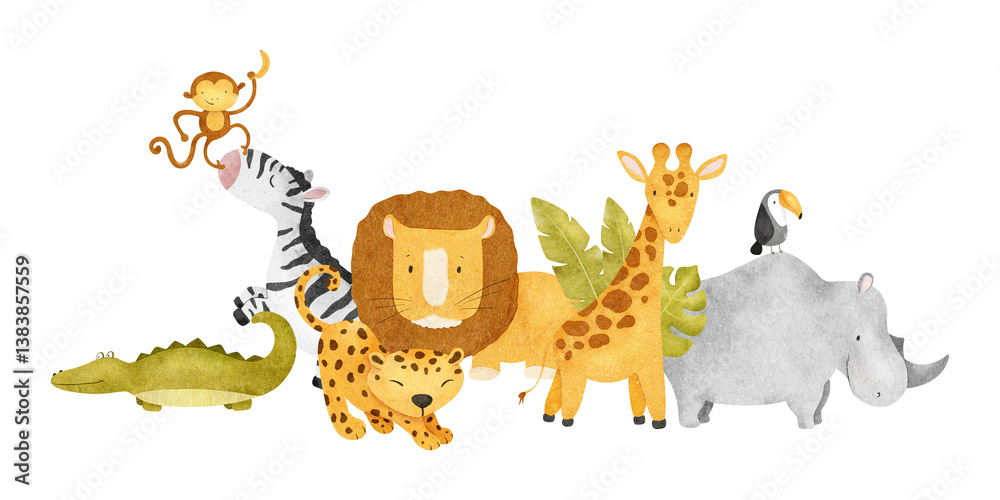 Fototapeta African jungles animals rhino, lion, monkey, giraffe, leopard, crocodile, toucan
