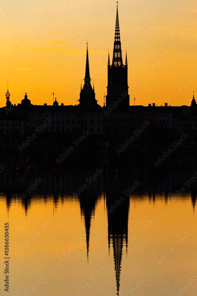 Fototapeta Stockholm, Sweden The Riddarholmen Church in silhouette against a dawn orange sky