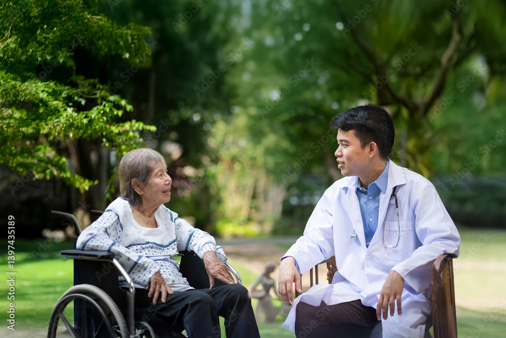 Fototapeta Doctor checking lung of elderly woman during homecare medical..