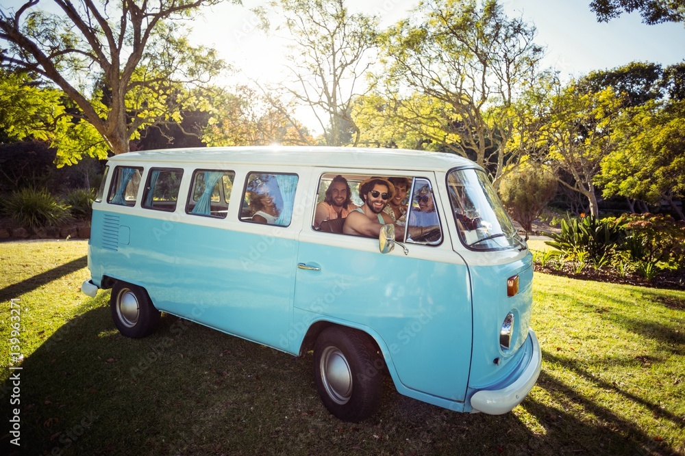 Fototapeta Group of friends travelling in campervan