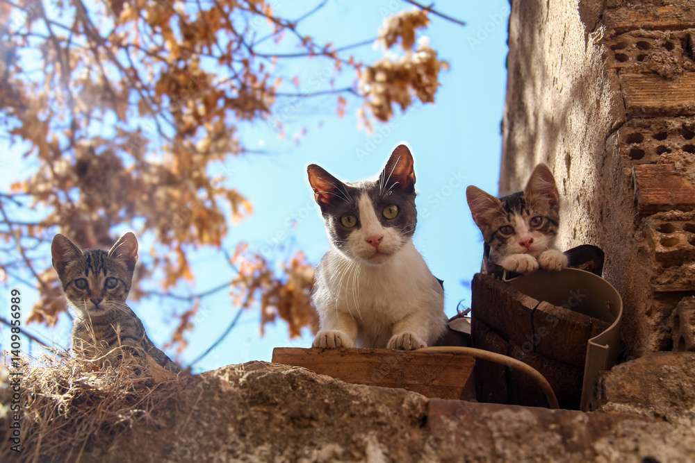 Fototapeta Mother Cat and Her Kittens on the Roof in Athens, Greece