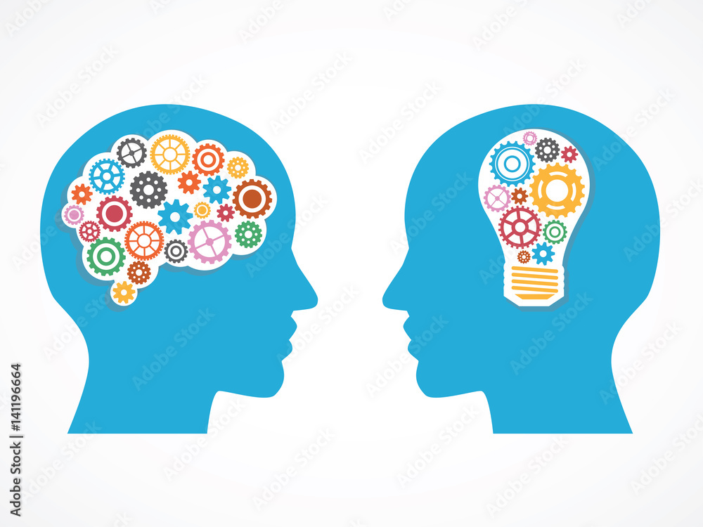 Fototapeta Heads of two people with gears, bulb and abstract brain for concept of idea and teamwork