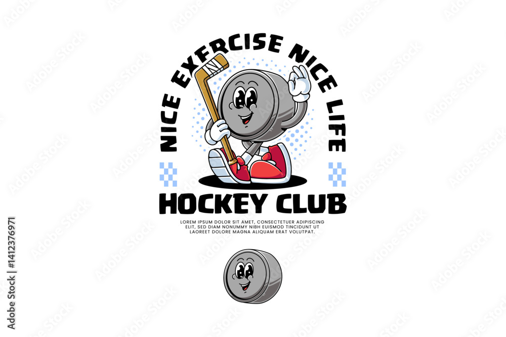 Fototapeta hockey puck retro cartoon character mascot illustration with walking pose, holdi