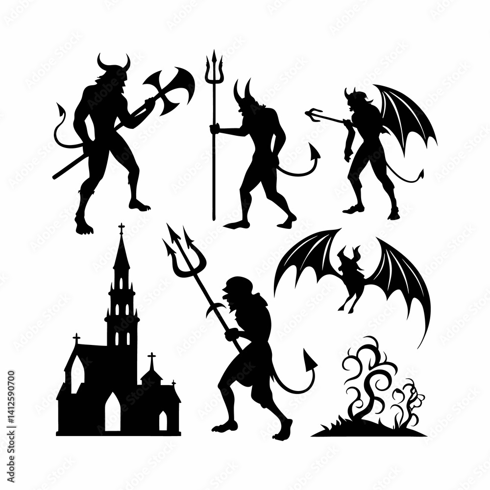 Fototapeta A set of four black silhouette illustrations of demons, each holding a trident