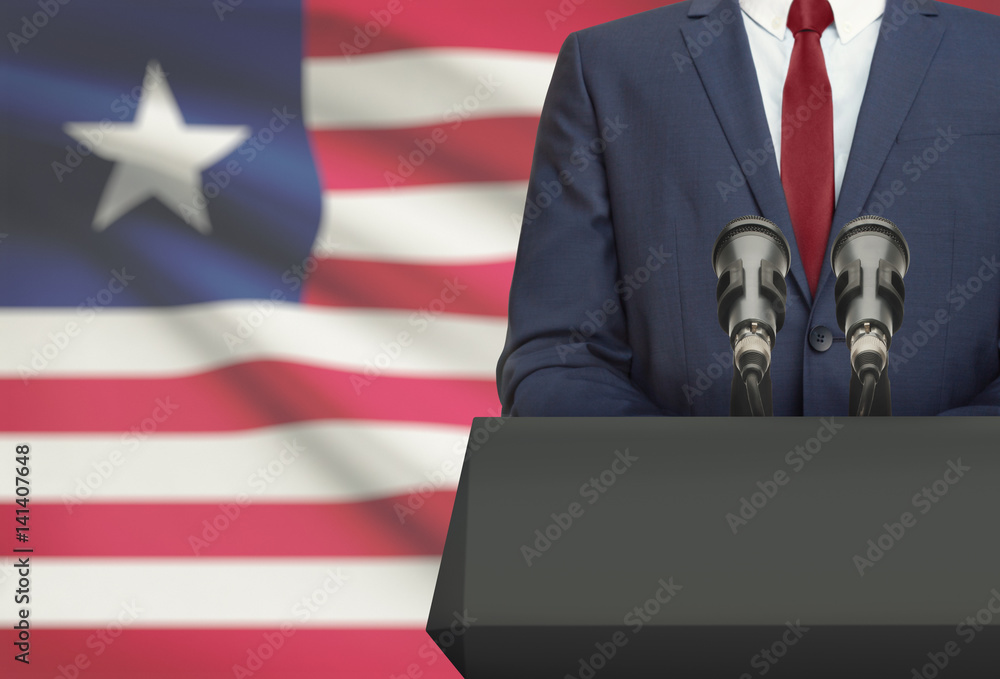 Fototapeta Businessman or politician making speech from behind a pulpit with national flag