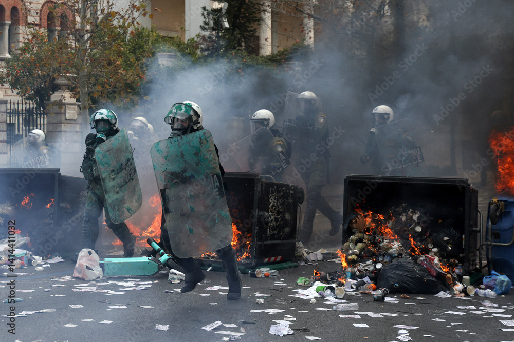 Fototapeta Riot Police Advance Past Burning Garbage Bins During Protest Near Greek Parliame