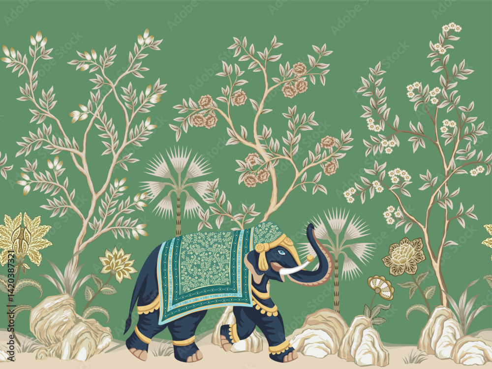 Fototapeta Vintage botanical tree, Indian elephant animal, flower seamless border green background