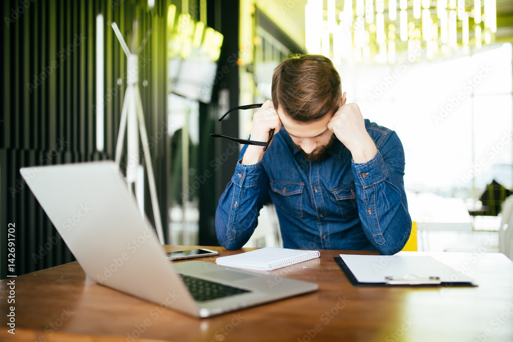Fototapeta Worried businessman lamenting in front of a computer after a big mistake at offi