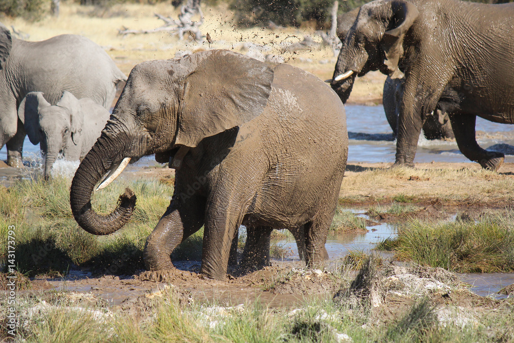 Fototapeta Group of elephants playing with mud and water in a waterhole