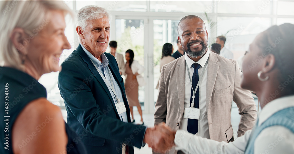 Fototapeta Conference, handshake and welcome with business people at event for global forum, investor summit and networking