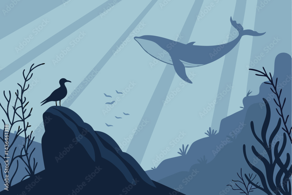 Fototapeta 36 Ethereal underwater scene, majestic whale silhouette, lone seagull perched at