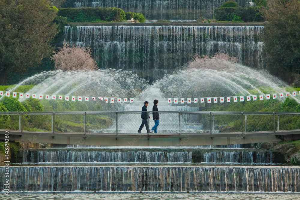 Fototapeta two young men walking in Laghetto Eur Park, in front of the main waterfall fountain
