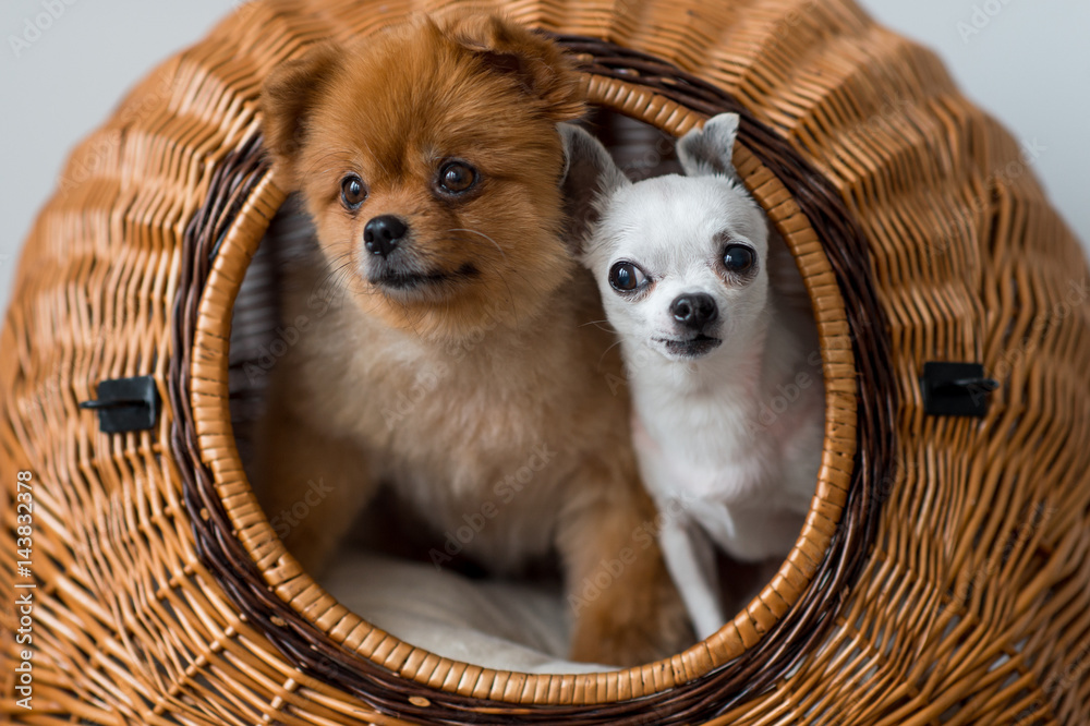 Fototapeta Close up of two lovely and pretty puppies - pomeranian and chihuahua dogs with f