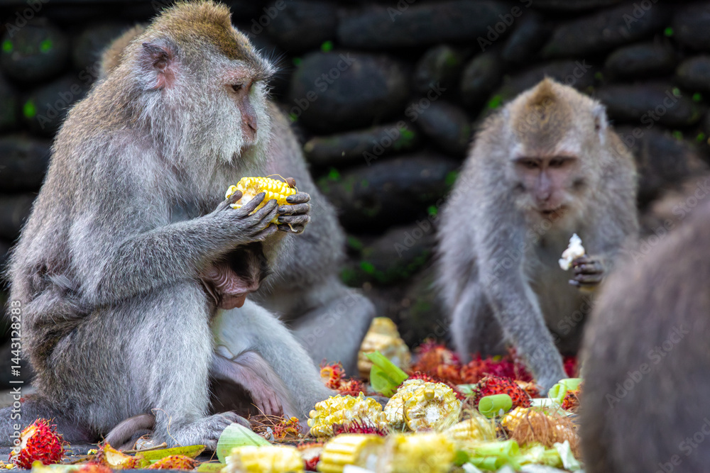 Fototapeta Monkeys eating fruit, image shows Balinese long-tailed monkey or Macaca Fascicul