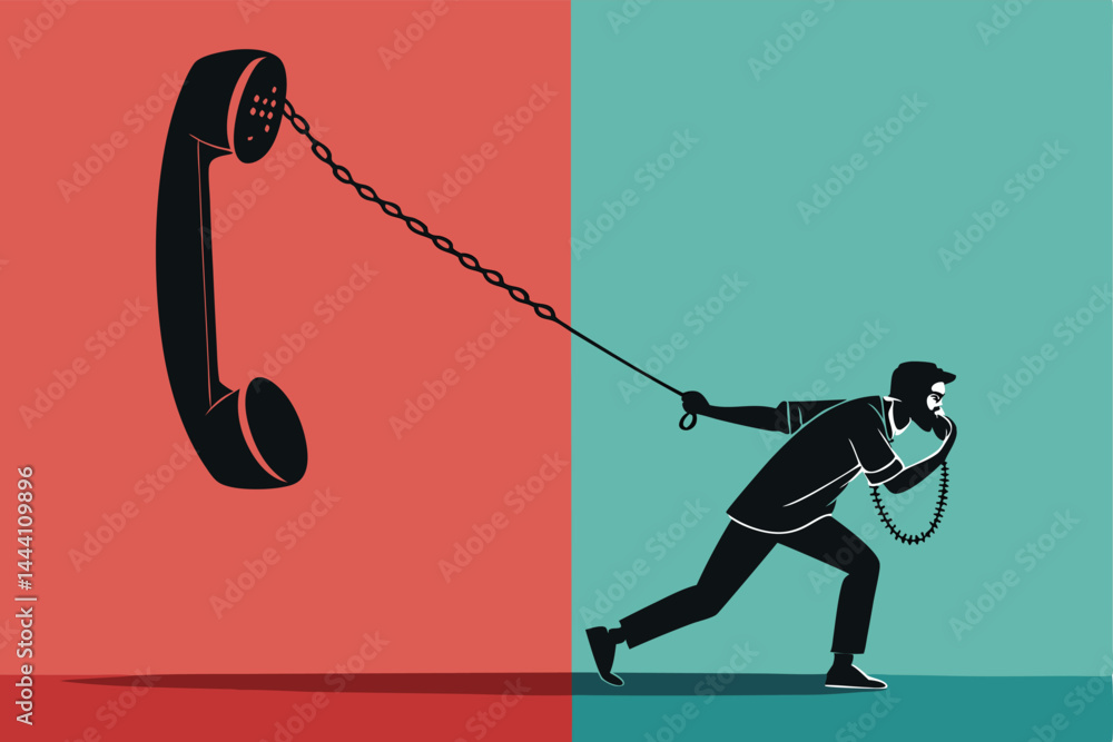 Fototapeta A person being dragged along the street by their smartphone, acting as a leash; satirical illustration depicting phone addiction