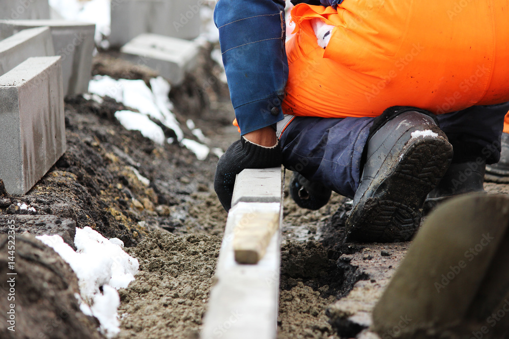 Fototapeta Working stonemasons repair the sidewalk, install curbs before asphalting for roa