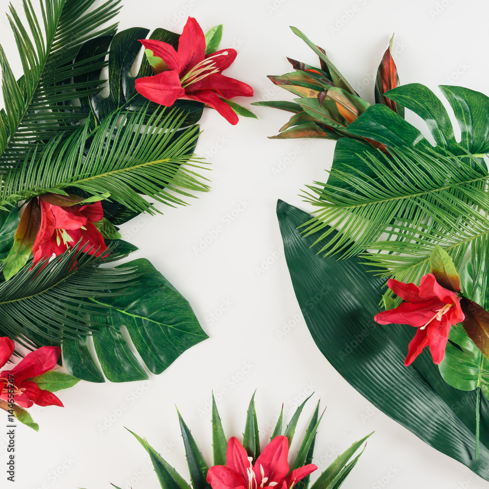 Fototapeta Creative layout made of tropical palm leaves and colorful flowers