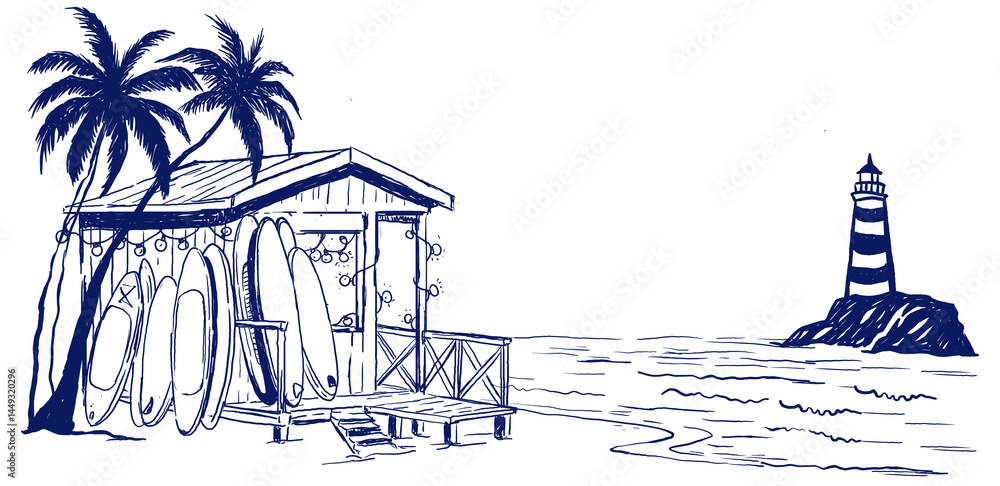 Fototapeta SUP station hut on the shore with boards and string lights, surrounded by palm trees, with a striped lighthouse on a distant rock