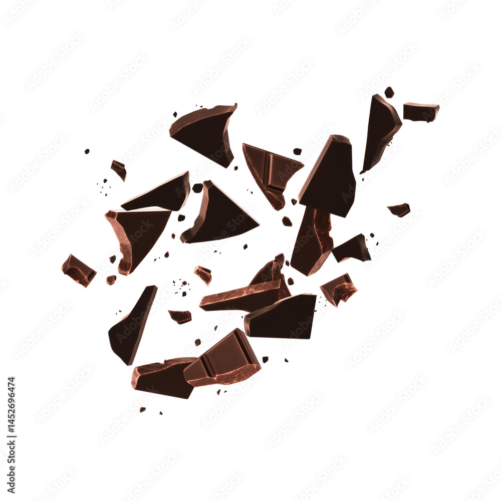 Fototapeta Fragments of exploded chocolate bar suspended in midair isolated on transparent