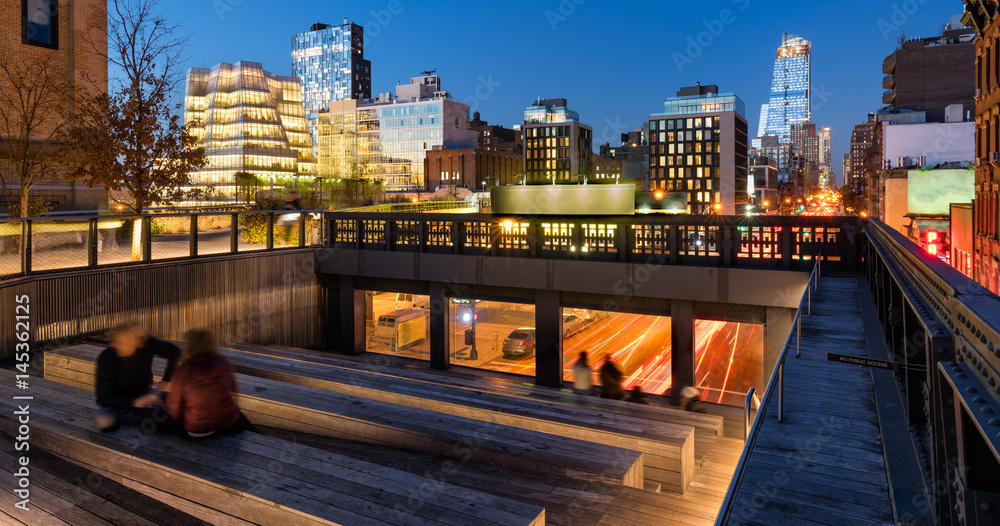 Fototapeta The High Line at twilight with a view on 10th Avenue with skyscrapers and building illumination