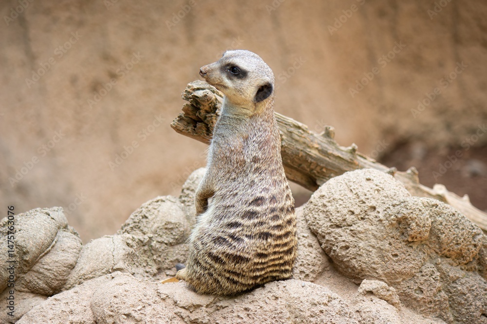 Fototapeta A vigilant meerkat perches upright on a sunbaked mound, its keen eyes scanning the surroundings