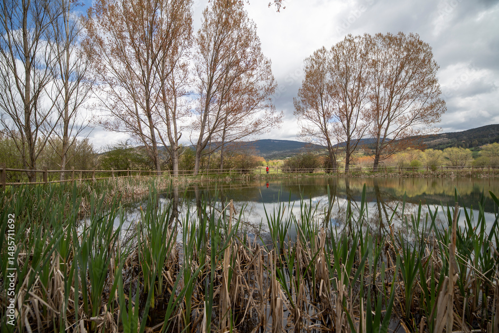 Fototapeta Curious color of the leaves of the poplars sprouting in spring