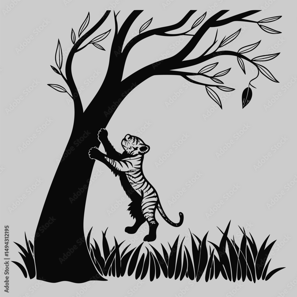 Fototapeta a tiger calf climbing a tree silhouette vector design art and illustration