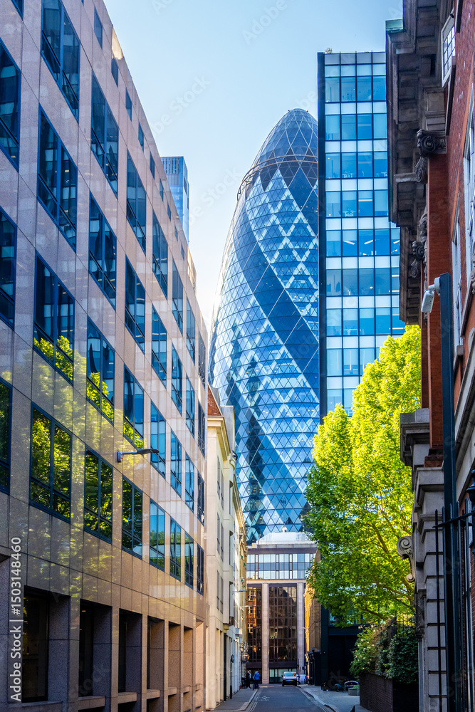 Fototapeta View of the Gherkin skyscraper framed by narrow street buildings in the City of