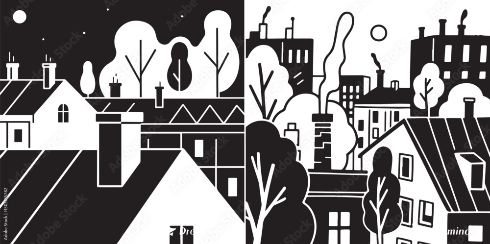 Fototapeta Black and white cityscape illustration showing rooftops and trees under a starry sky