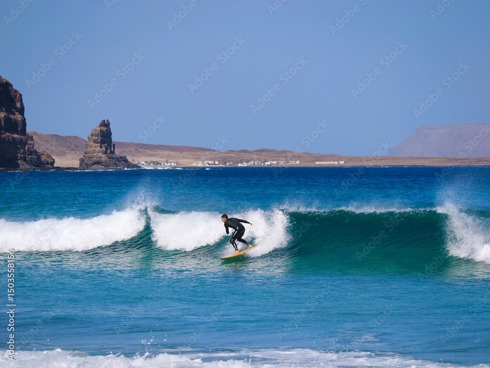 Fototapeta Surfer rides a clean wave with volcanic cliffs and a village in the background on Lanzarote