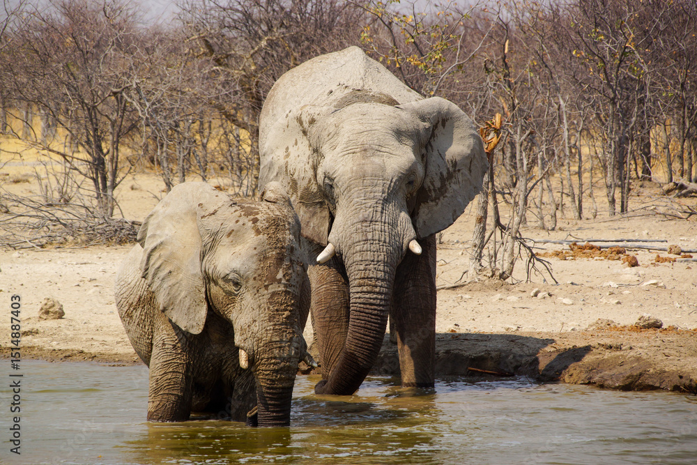 Fototapeta Two African Savannah Elephants (Loxodonta africana) drinking at a waterhole, Nam