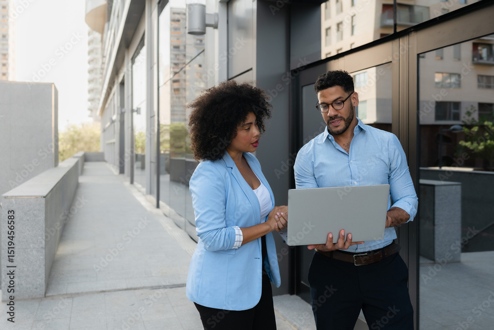 Fototapeta Two business multiracial partners using laptop outside office discussing investm