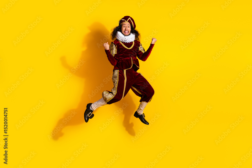 Fototapeta Young man jumping in an ornate nobleman costume against vibrant yellow backgroun