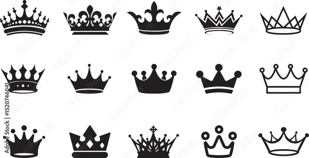 Fototapeta This versatile vector icon set features a diverse array of crown styles, from classic king and queen emblems to minimalist and modern tiara and coronet designs, making it a trending asset