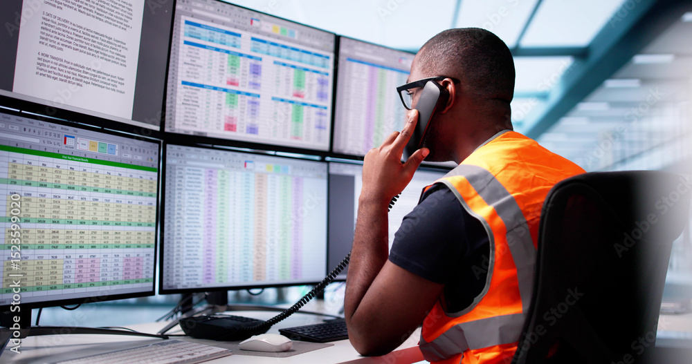 Fototapeta Urgent Police Dispatch: Young African American Man Monitors Emergency